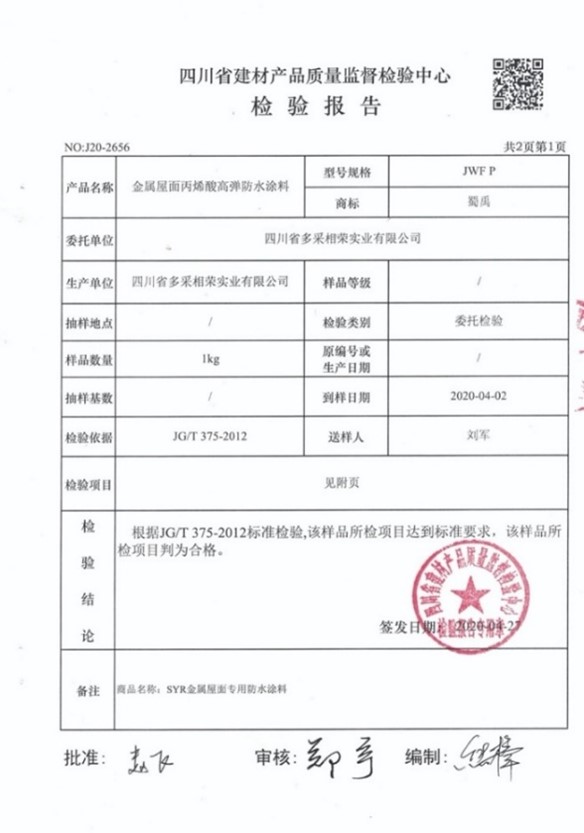 SYR金屬屋面專用防水涂料能在基層表面形成有強粘結力的彈性防水膜,與基層構成一個剛柔結合完整的防水體,能適應建筑結構的各種變形,從而達到長期防水抗滲的作用。優異的耐沾污和耐侯性,減少維護次數,減低維修成本;優異的隔熱反射性能,能延長基材的使用年限;耐老化、耐磨、耐紫外線、耐鹽霧、耐濕熱性優異;