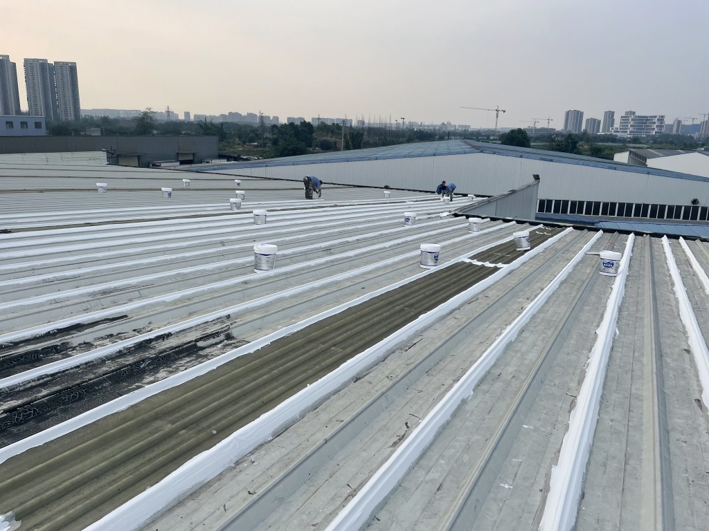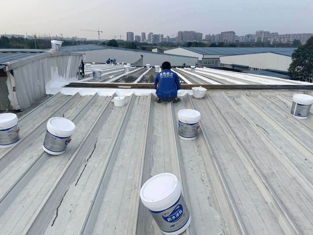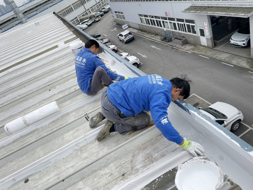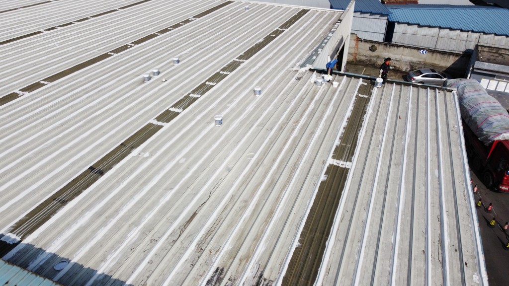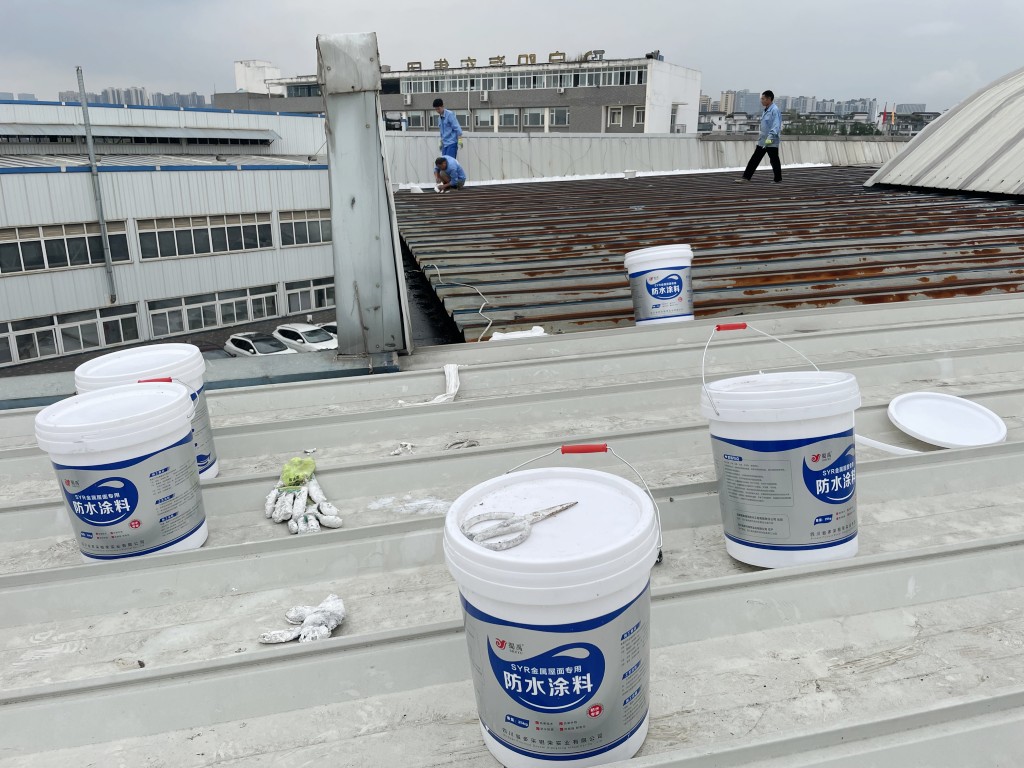 啟陽汽車華陽園區(qū)豐田鈑金車間與美容區(qū)及洗車區(qū)彩鋼頂防水工程由成都蜀禹建筑防水工程有限責任公司2021年8月進行施工,廠房為鋼結(jié)構(gòu)的彩鋼頂,彩鋼頂漏水點位較多,并且豐田接車雨棚位置一塊區(qū)域彩鋼頂表面生銹了,先針對彩鋼頂進行防水處理之后此處還對彩鋼表面滿涂SYR金屬屋面防水系統(tǒng)進行防銹施工。此次針對此廠房頂部采用蜀禹SYR金屬屋面專用防水涂料配合專用縫織聚酯布進行施工處理,處理后經(jīng)多次下雨檢驗驗收合格。