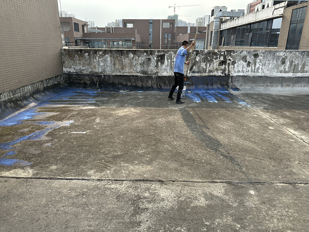 我公司現(xiàn)場施工工藝流程為:先將屋頂基層起殼易脫落的清理掉,破損部位水泥砂漿局部修補(bǔ),然后基層表面滿涂刷混凝土液體硬化劑進(jìn)行基層固化處理,這樣處理的好處是,后面做的防水層能夠與基層牢牢的粘結(jié)在一起;待混凝土液體硬化劑固化之后,屋頂?shù)牡孛婕皦γ嫒繚M涂刷蜀禹Ⅰ型聚合物水泥防水涂料然后滿鋪貼專用的縫織聚酯布再涂刷蜀禹Ⅰ型聚合物水泥防水涂料,待干后表面涂刷蜀禹Ⅰ型聚合物水泥防水涂料,等待干后表面再涂刷兩道SYR金屬屋面防水涂料涂層。施工完畢之后,等待施工的防水涂層干透之后,屋頂做閉水試驗(yàn)一星期后不漏水驗(yàn)收合格之后交驗(yàn)。