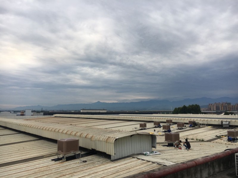 成都市大邑縣工業區龍廚食品廠房內由于夏季溫度太高,廠房內安裝冷風機,但是由于是在以前已經修建好的彩鋼頂上開孔安裝冷風機,冷風機安裝好之后,冷風機排風管穿過彩鋼頂的地方開的孔周邊漏水,我公司采用瀝青防水卷材施工,對排風孔周邊進行了防水補漏處理。